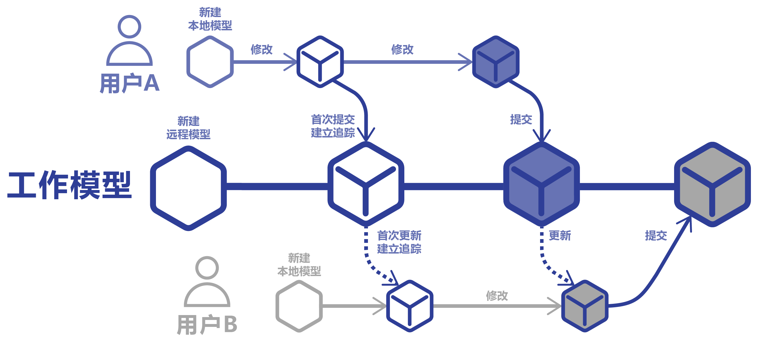 - 【提交】将某个当前的模型修改提交到远程,提交以后会产生一个新的远程版本。提交操作时,要确保本地模型基于最新的远程版本。